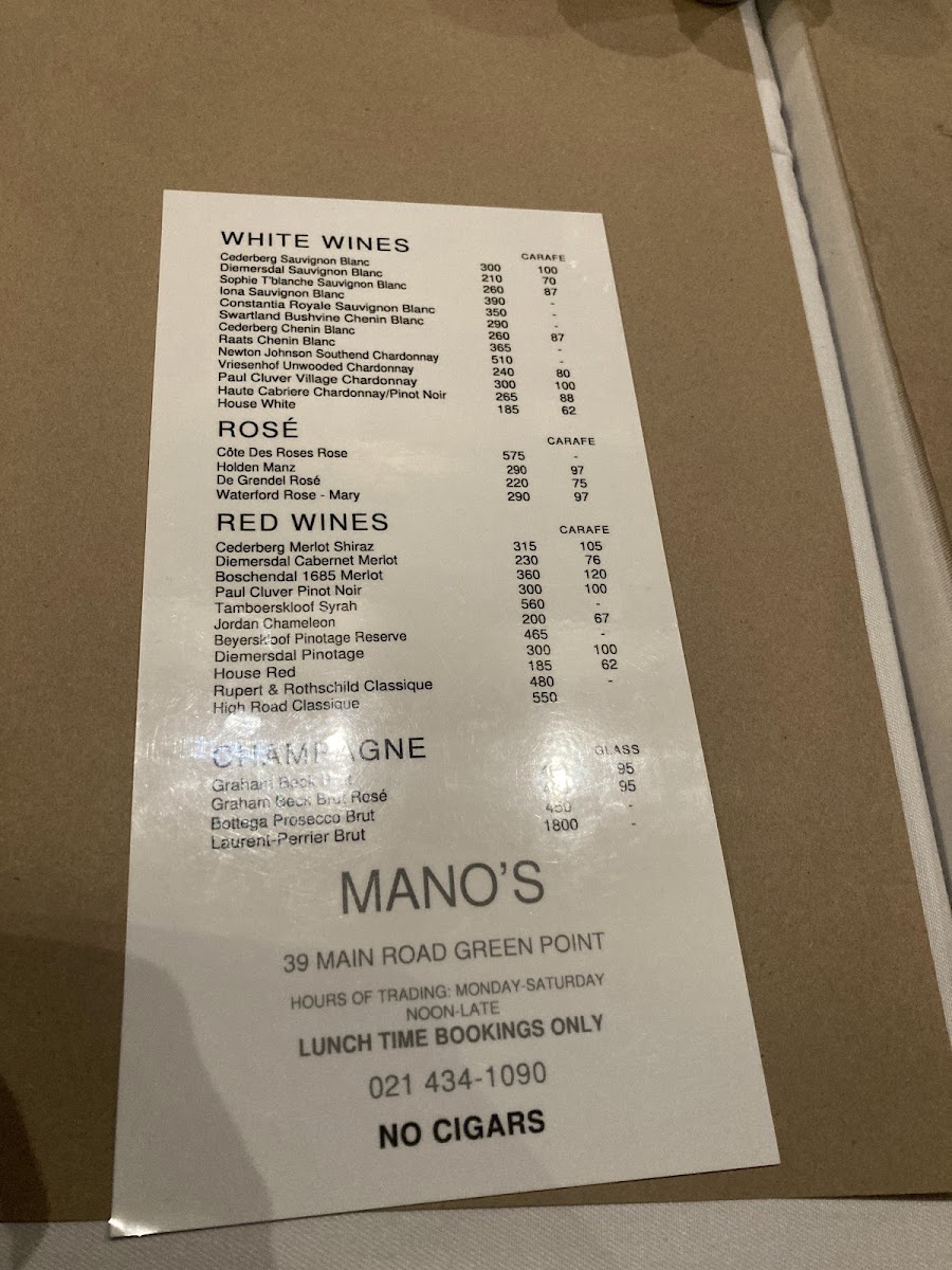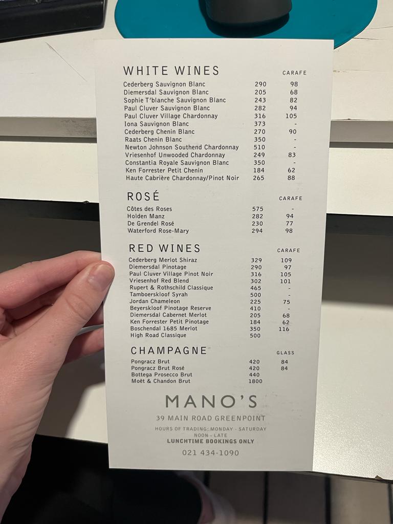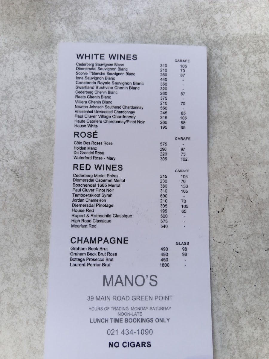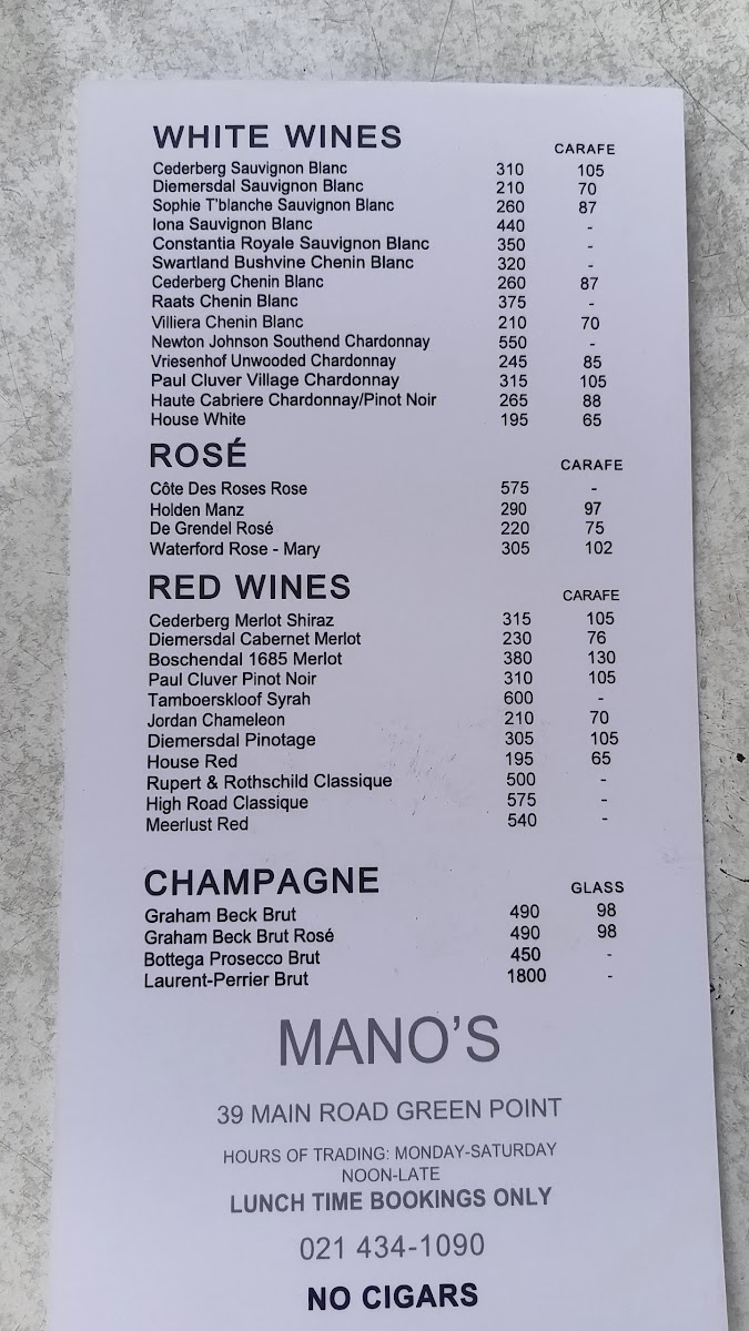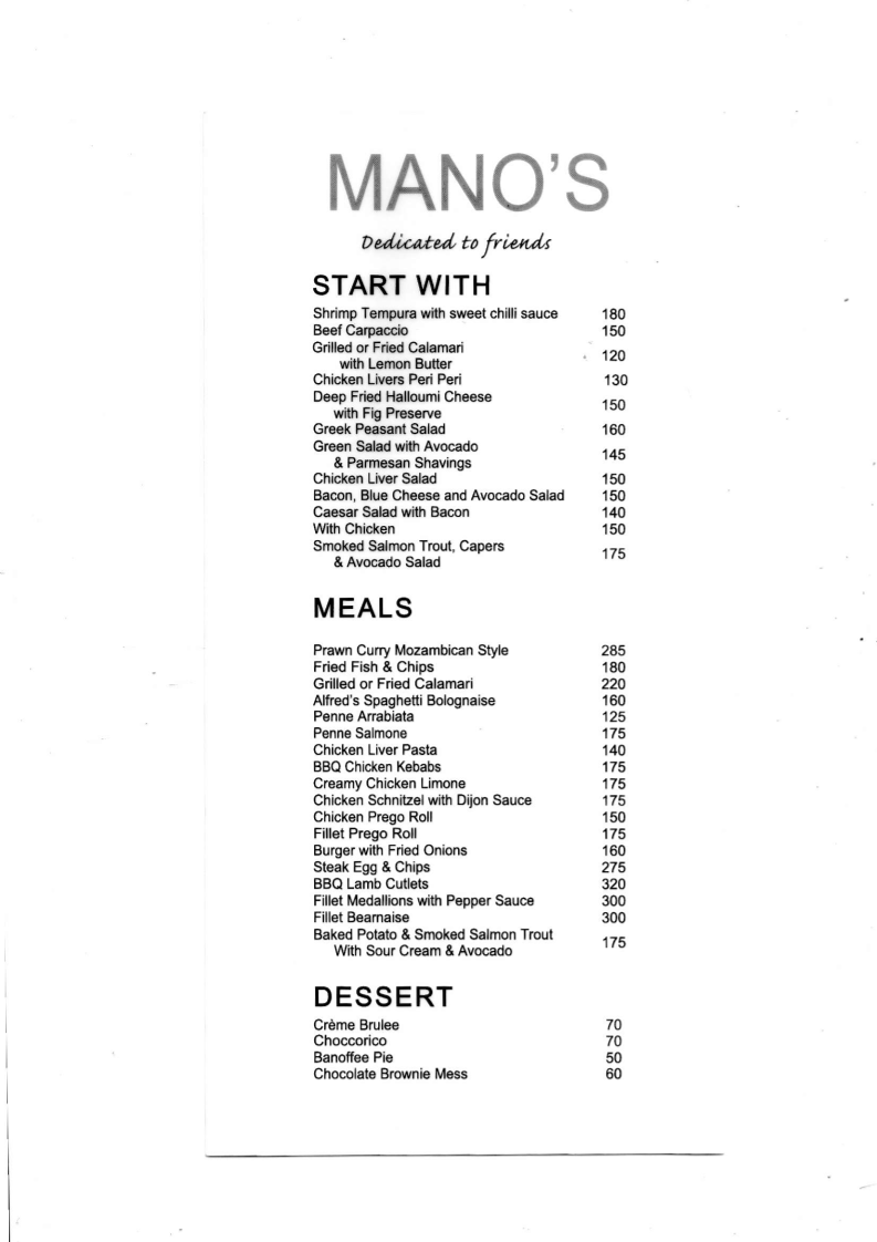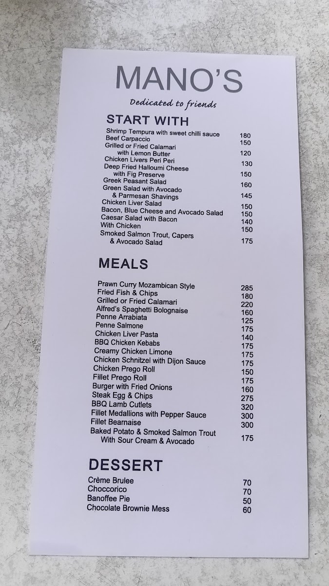 Welcome to Mano's, a vibrant culinary gem nestled in the heart of Green Point, Cape Town. Known for its stunning venue and delightful atmosphere, Mano's offers an extensive menu that showcases a variety of delectable dishes. Renowned for their Fillet Prego Rolls and fresh Kingklip, customers rave about the rich flavors and quality of the cuisine. Those seeking an adventurous palate can indulge in the flavorful Chicken Liver Peri Peri and Prawn Curry, both highly praised for their delightful spices and creamy sauces.